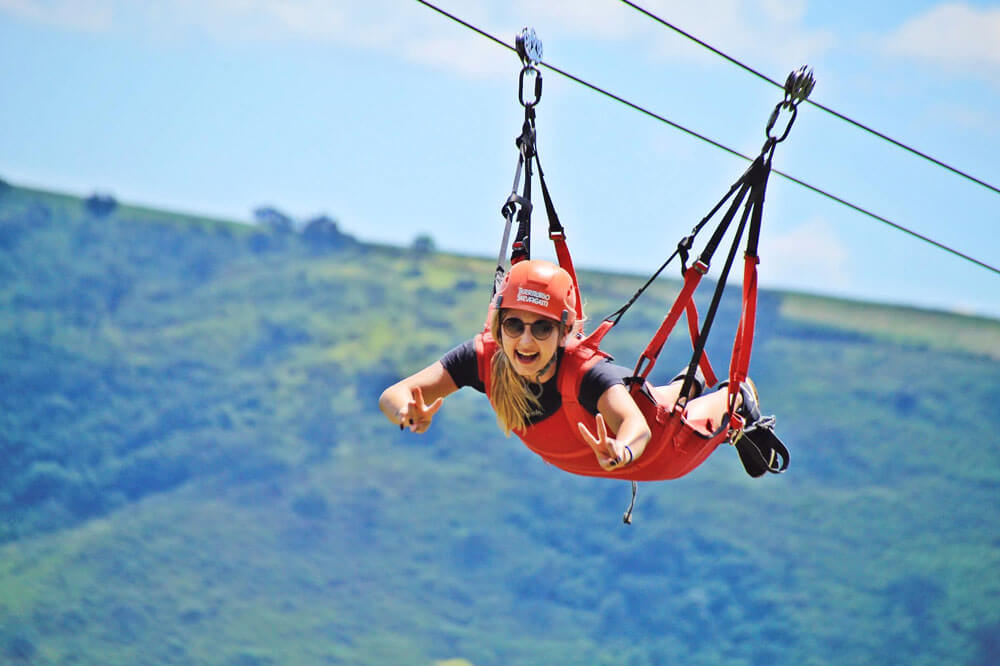 Já pensou em voar a 150 metros de altura como um super-herói, uma ave ou do jeito que sua imaginação quiser? Essa é a vibe da Super Tirolesa! São duas tirolesas: a primeira com 1,1 km de extensão e a segunda com 800 metros — emoção do começo ao fim.